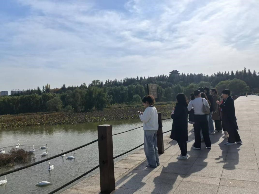 行程第三站,留学生们抵达天鹅湖湿地公园。这座集生态保护与人文景观于一体的国家4A级旅游景区,每年11月至次年3月都会吸引数万只白天鹅前来越冬栖息,三门峡市也因此被誉为“天鹅之城”。入园后,于杰丽老师首先为留学生们介绍了公园的占地面积、组成部分及生态保护价值,让大家对这片“天鹅家园”有了初步认知。