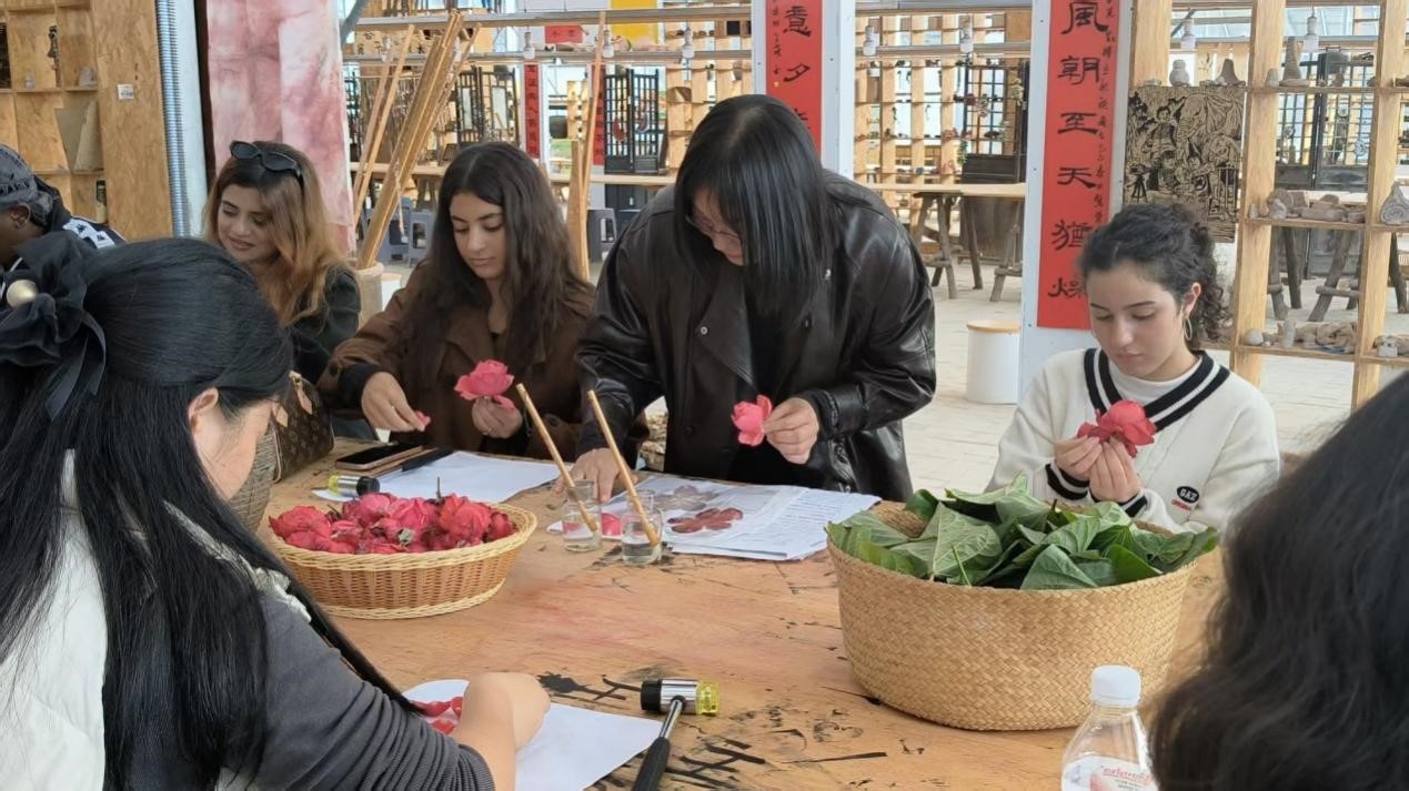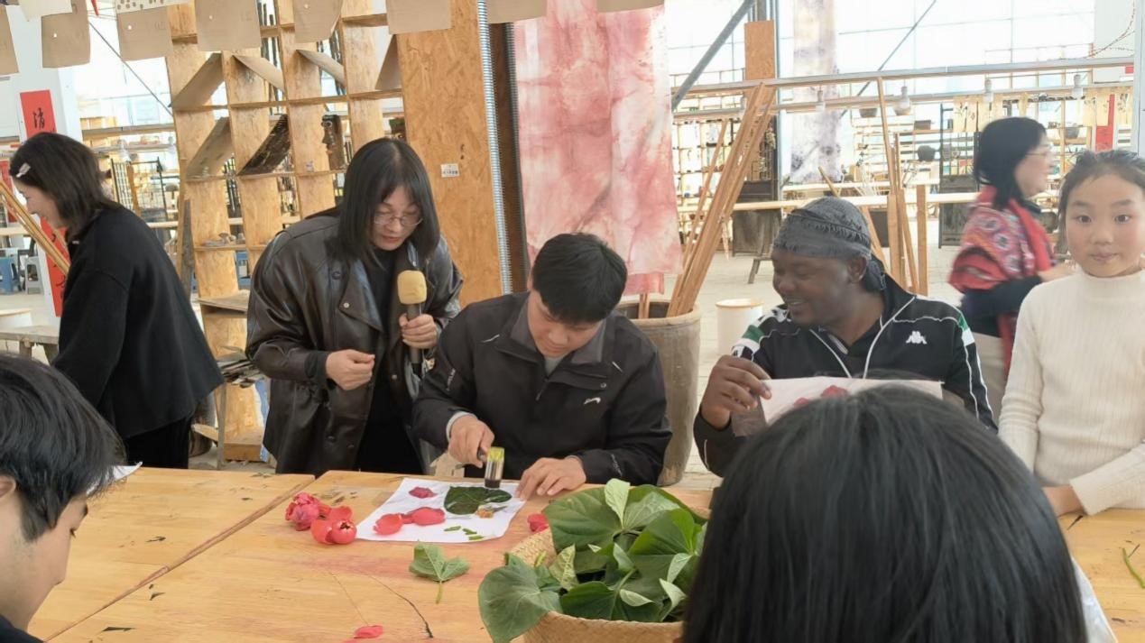 留学生们沉浸在创作乐趣中,互相交流技巧、分享喜悦,遇叶片摆放不稳、汁液晕染不均等问题时,老师及时指导。留学生们惊叹无颜料也能成画,感慨自然与艺术的巧妙结合,直言捶打过程治愈且成就感满满。